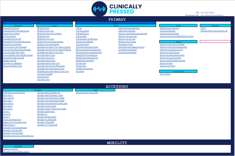 We have consolidated and organized our exercise library to try and make it as easy as possible to find videos of the exercises you need and you can get to them without having to listen to a long introduction or explanation. We will continue adding to the library and there are links within the spreadsheet where you can check back for more exercises. If you purchase from here we will email you with major updates.